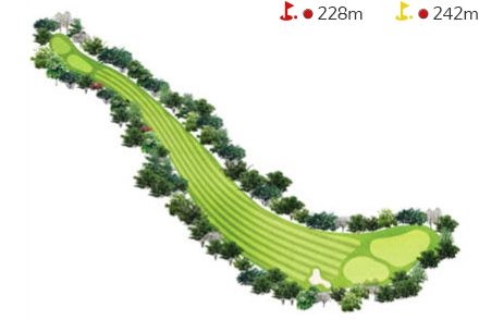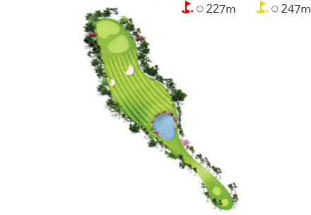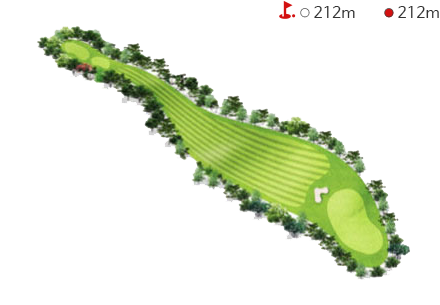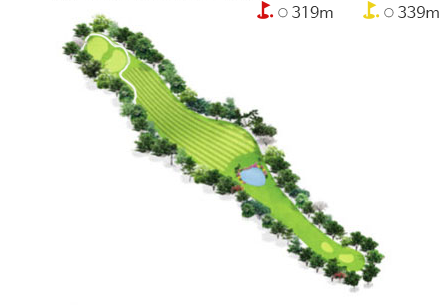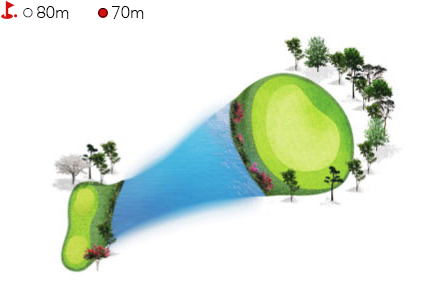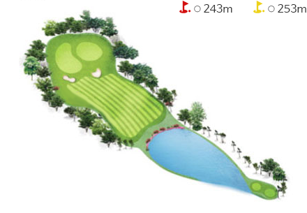 - 티그라운드 앞에 해저드가 있어 섬세한 플레이를 요구하는 홀이다. 티박스에서 140m 거리의 해저드를 넘겨야하고 오르막 홀로 경사가 있어 1~2클럽 크게 공략하는 것이 유리하다. 티샷은 페어웨이 중앙 그라스벙커를 보고 공략하는 것이 좋다.