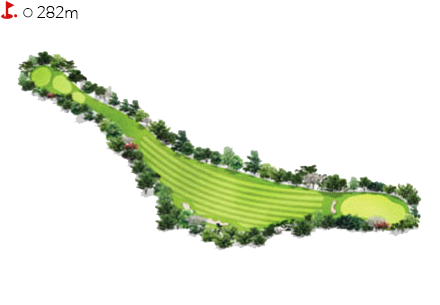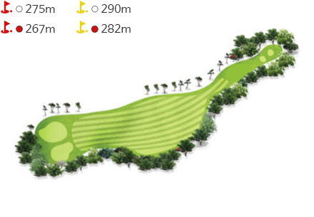 - 남성의 경우 7번 이하 아이언으로 티샷이 가능하게 로컬룰로 지정된 홀이다. 티샷은 그린벙커를 보고 공략한다. 다소 짧은 파4홀이지만 결코 파세이브가 쉽지 않다. 그린 라이의 변화가 심해 끝까지 정확하고 정교한 플레이를 요하는 홀이다.