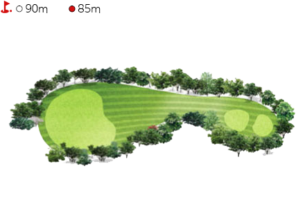 - 좌측에 대한 불안함으로 볼이 우측으로 향하는 경우가 많은 홀이다. 그린 중앙을 보고 공략하는 것이 안전하나 필요 시 중앙 소나무의 빨간 달을 보고 샷을 하면 된다. 평상 시 1클럽 작게 보고 공략하나 바람의 영향에 따라 거리를 다 보고 샷을 해도 된다.