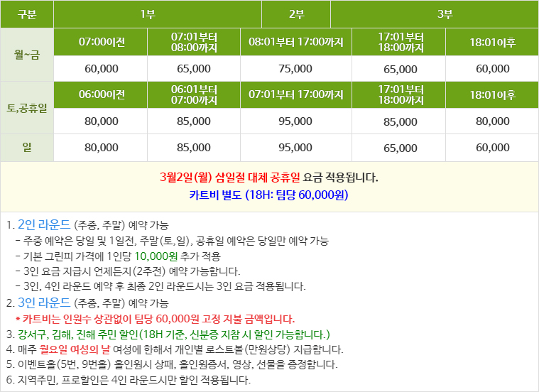 주중 1팀 4인 구성 시 재직 중 레슨 프로 1인 주중 그린피 10,000원, 주말 및 공휴일 그린피 50% 할인 주중 1팀 4인 구성 시 일반협회 회원 1인 그린피 5,000원 할인 (이벤트 및 중복 할인 불가, 18H 기준) |